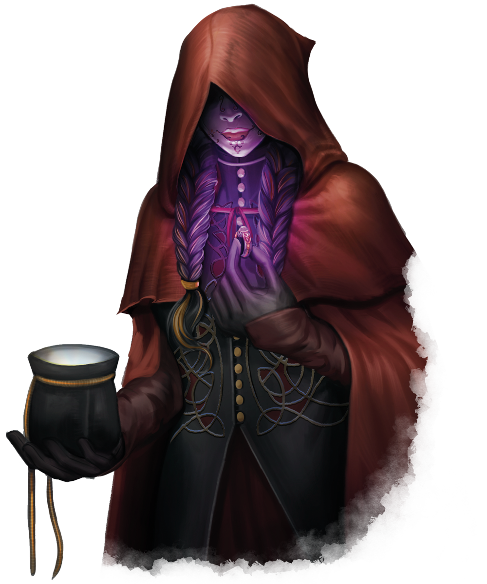 The Merchant can take any form; she can be an old woman, a young artificer, or a masked fey figure. Having said that, she generally doesn’t try to deceive the people she bargains with. Her story is well known, and strengthened with each deal that she makes; why hide it? This also helps to differentiate her from