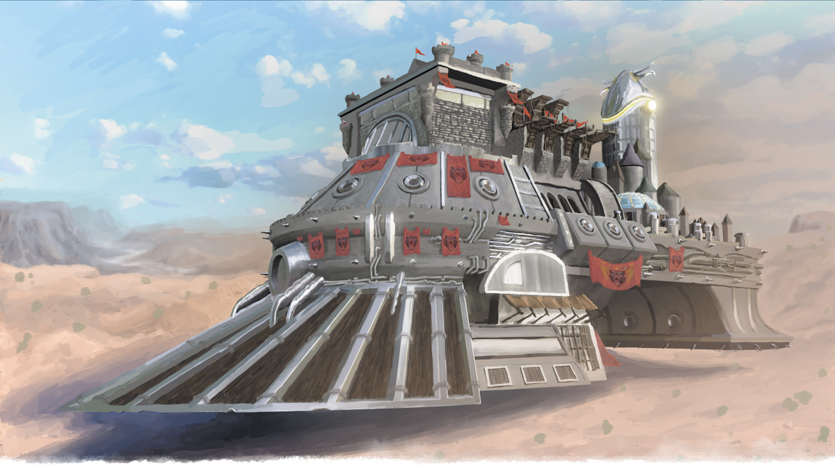 The Prow. The lower front of Argonth is a massive, solid steel ram. Argonth may not be fast, but at its full speed it can easily crush light walls. A shielded gunnery bay holds a Force Staff and emplacements for four Long Rods, with three-quarters cover for the gunners. Behind the ram, the forward garrison is designed for rapid deployment of up to three hundred soldiers at once.