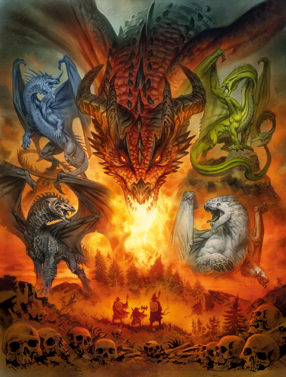 Three brave adventurers face the unknown dangers presented by the five kinds of chromatic dragons in this dramatic poster image by Greg Staples.