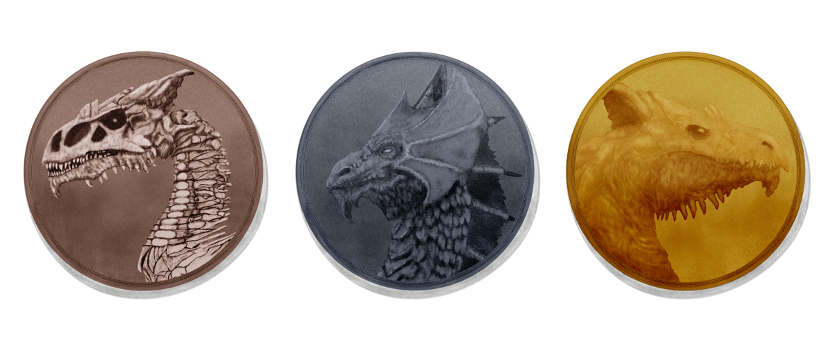 The holy symbol of the Three Faces of Coin is three coins. When someone is initiated into the sect, they receive three special coins: a copper coin with the dracolich profile of Kol Turrant, a silver coin with a brass dragon for Onatar, and a gold coin with a white dragon profile for Kol Korran. While these coins are treasures, any spread of copper-silver-gold can be used as a signal. This is also the origin of the term Pennyroyal, as the copper coin of the Keeper is sometimes called a penny; “Penny Royal’’ thus means “Keeper’s Chosen.”