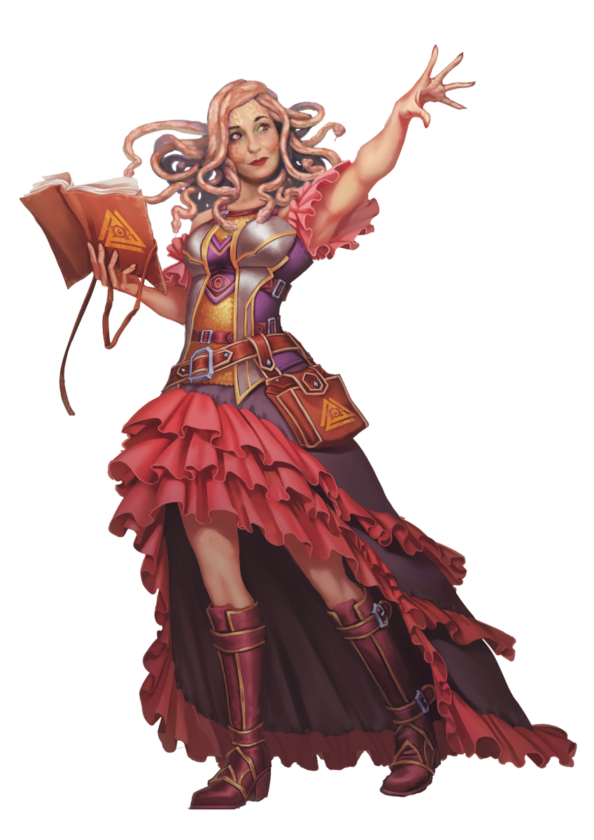 From a distance, a medusa can be mistaken for a human. The serpent mane is the first thing that dispels that illusion—a wreath of writhing snakes coiling around the medusa’s face. Typically, the actions of the serpents are an expression of the medusa’s mood. If you’re playing a medusa, consider how your serpents may react to situations or to strangers. If you’re angry, do they hiss and snap at your foe? If you’re curious about someone, do your serpents follow their movements even while you try to play it cool?